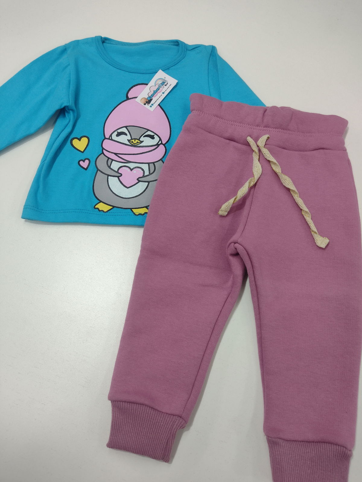 Incluye camiseta super tierna de pingüinos y babucha en tono uva frizada
